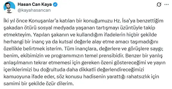 “İki yıl önce Konuşanlar’a katılan bir konuğumuzu Hz. İsa’ya benzettiğim şakadan ötürü sosyal medyada yaşanan tartışmayı üzüntüyle takip etmekteyim. Yapılan şakanın ve kullandığım ifadelerin hiçbir şekilde herhangi bir inanç ya da kutsal değerle alay etme amacı taşımadığını özellikle belirtmek isterim. Tüm inançlara, değerlere ve görüşlere saygı; benim, ekibimizin ve programımızın temel prensibidir. Benzer bir yanlış anlaşılmanın tekrar etmemesi için gereken özeni göstereceğimi ve yayın içeriklerimizi bu doğrultuda daha dikkatli değerlendireceğimizi kamuoyuna ifade eder, söz konusu hadisenin yarattığı rahatsızlık için samimi bir şekilde özür dilerim.”