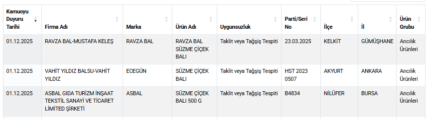 Tarım ve Orman Bakanlığı, 1 Aralık 2025 tarihli güncel taklit–tağşiş listesini kamuoyuyla paylaştı. Listede bal kategorisinde üç farklı marka için “taklit veya tağşiş” yapıldığı tespit edildi.